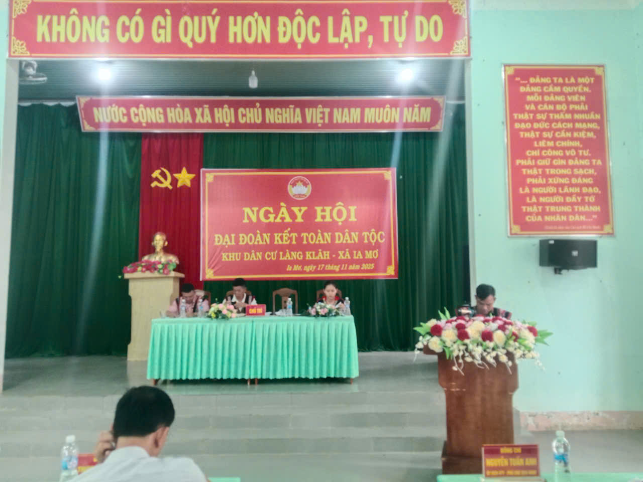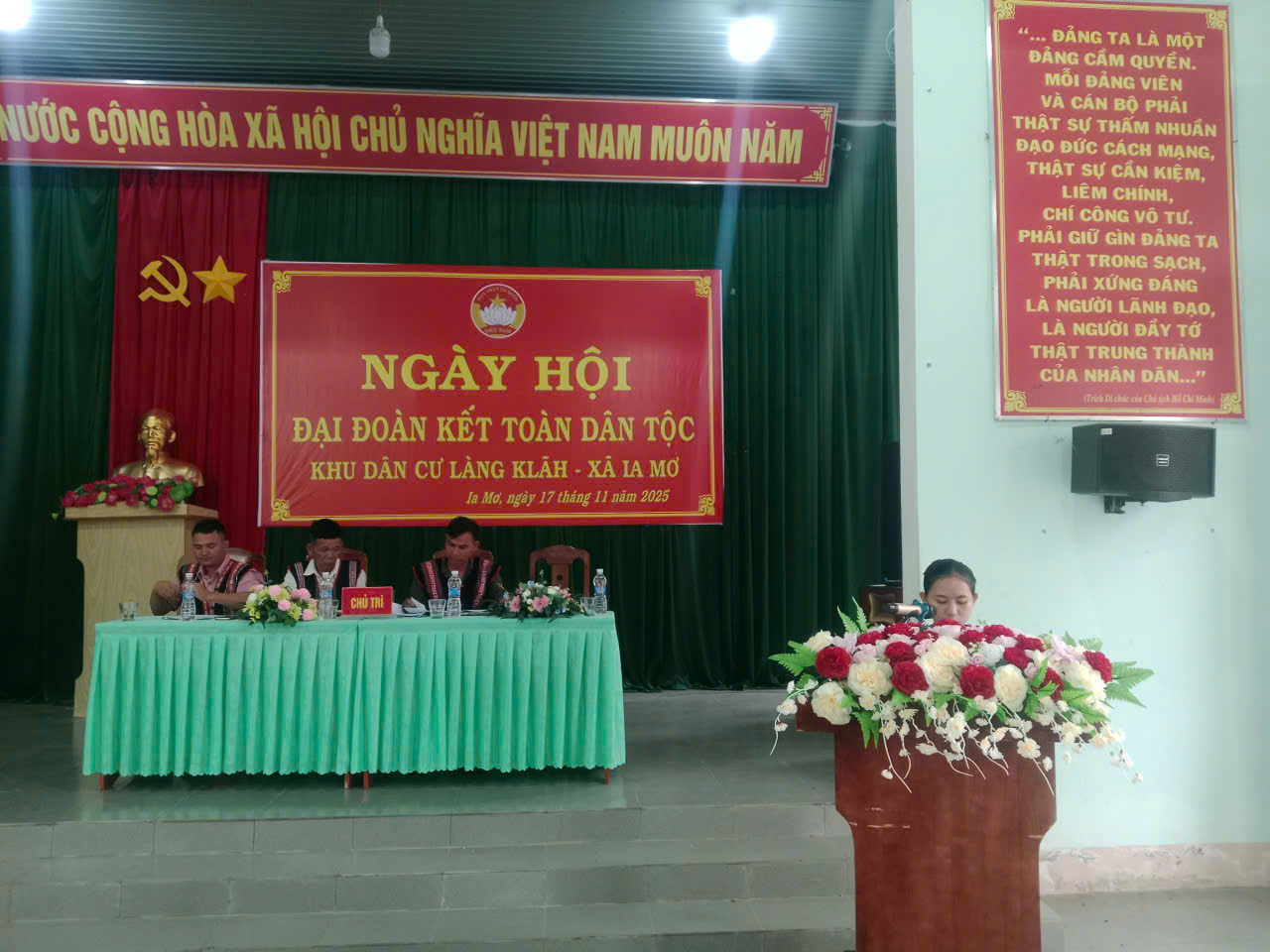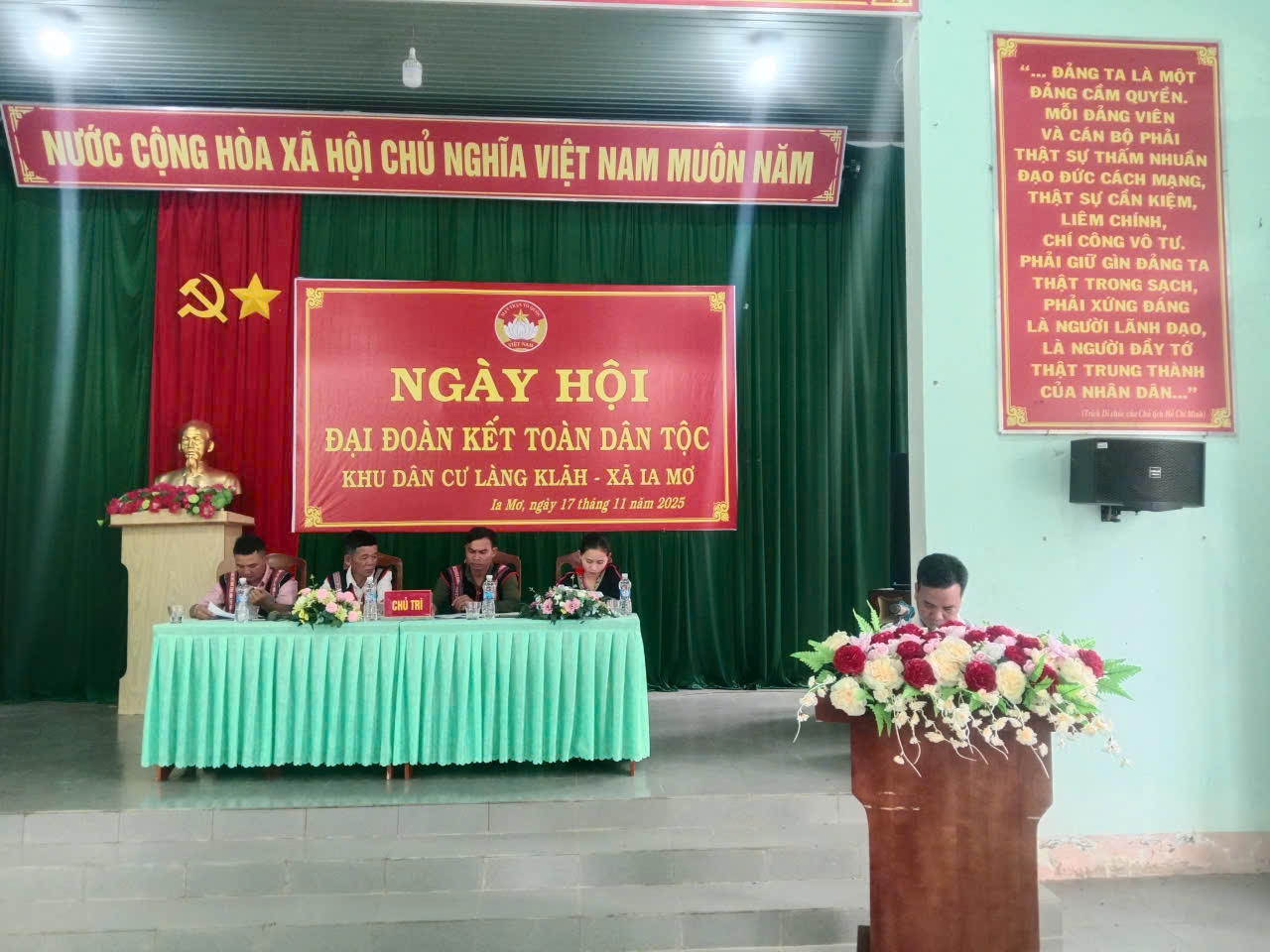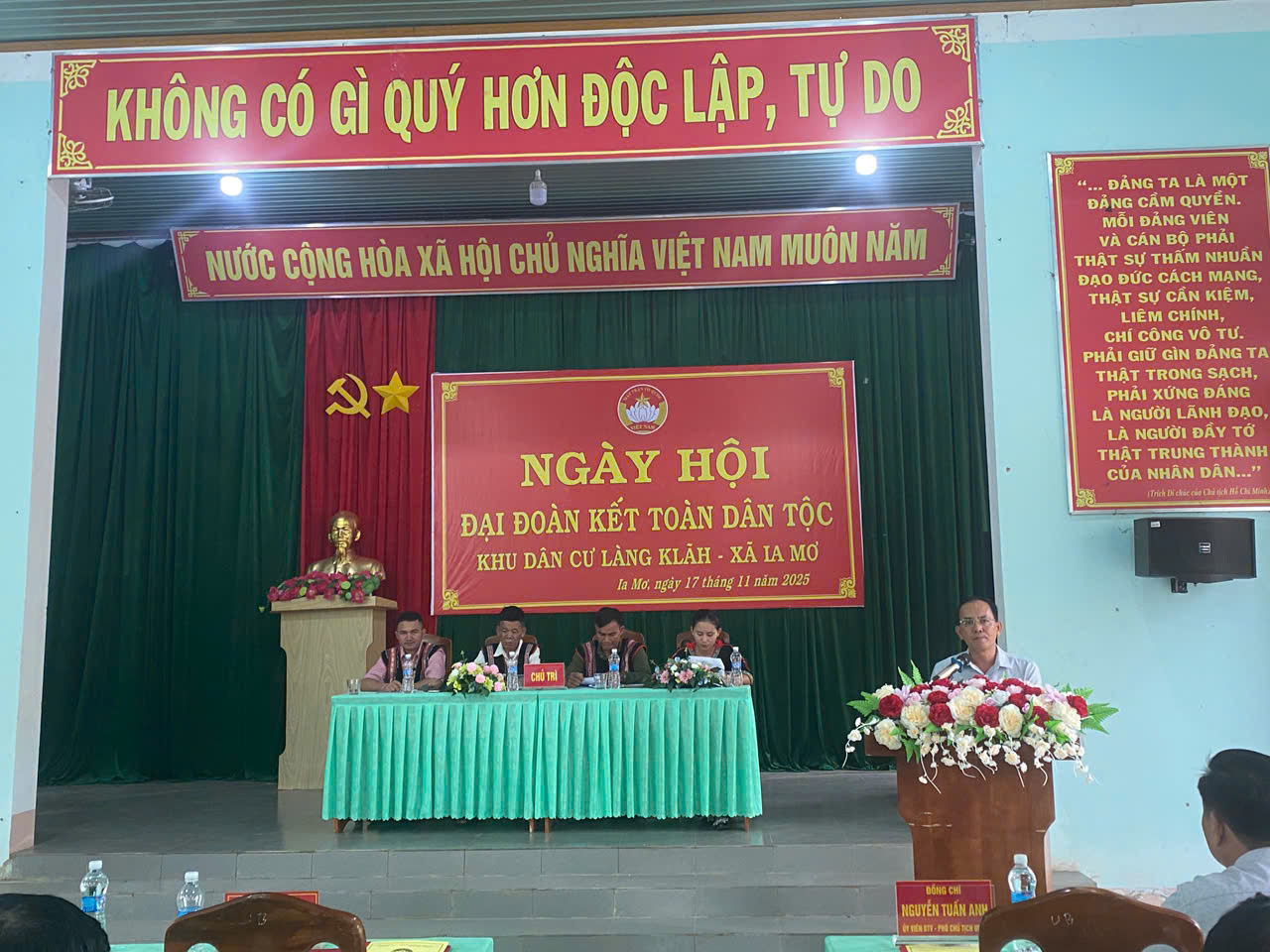 Trong không khí phấn khởi của cả nước thi đua lập thành tích chào mừng kỷ niệm 95 năm Ngày truyền thống Mặt trận Tổ quốc Việt Nam (18/11/1930 - 18/11/2025), sáng ngày 17/11/2025, Làng Klăh – xã Ia Mơ long trọng tổ chức Ngày hội Đại đoàn kết toàn dân tộc năm 2025. Đây là thôn, làng được xã Ia Mơ chọn làm điểm để rút kinh nghiệm trong việc tổ chức cho các thôn, làng còn lại của xã.